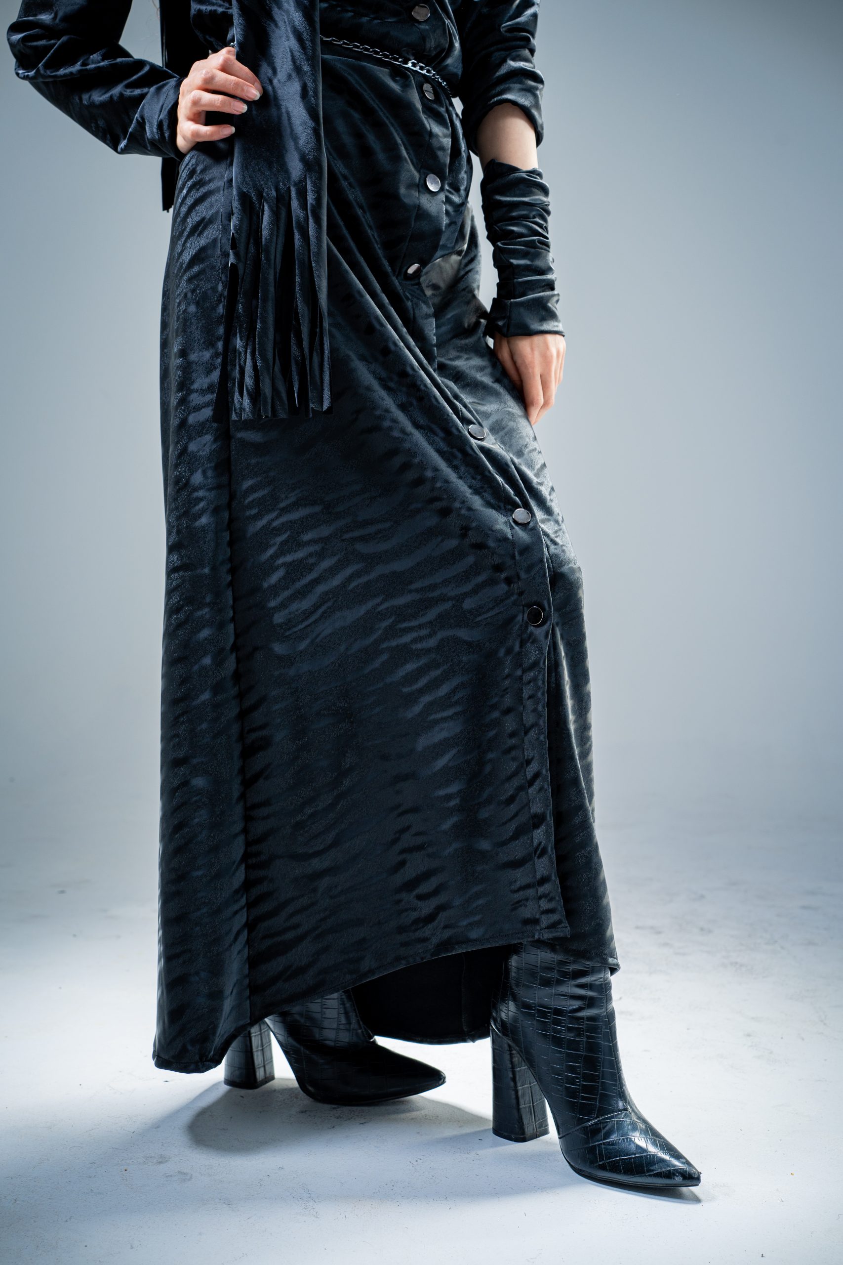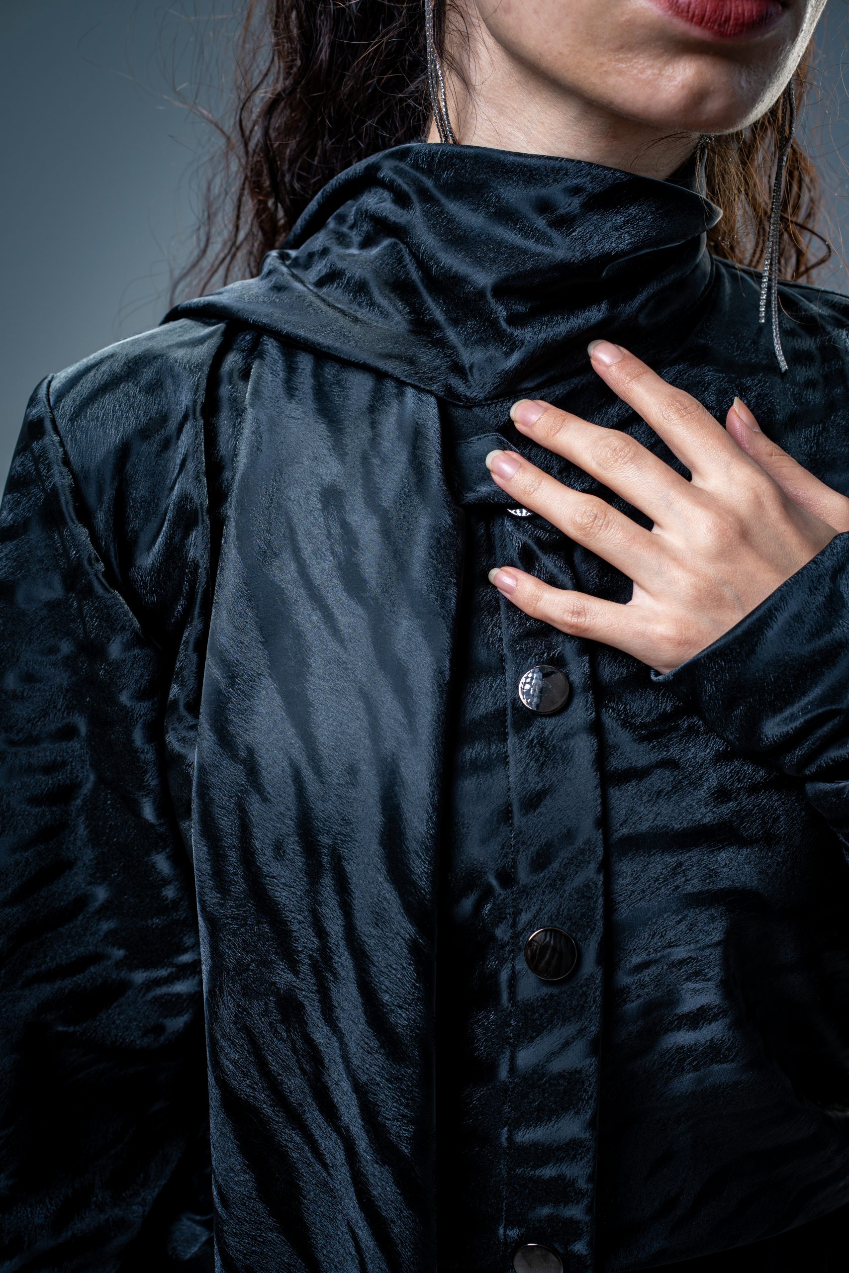 Crafted from premium thermal leather with a subtle animal texture, Features detachable tie scarf and elegant side ruching that enhances the silhouette. Designed for comfort and movement, it blends warmth with timeless modern style.